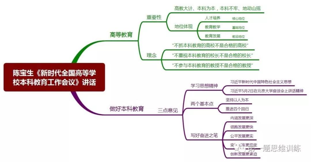 教育部党组书记、部长陈宝生在刚结束的新时代全国高等学校本科教育工作会议上,就如何把本科教育放在人才培养的核心地位、教育教学的基础地位、新时代教育发展的前沿地位发表了重磅讲话,陈宝生部长讲话的重点和要点是什么?一起看看中国大学慕课《思维导图的教学应用》课程团队用思维导图解读的讲话,及讲话全文。